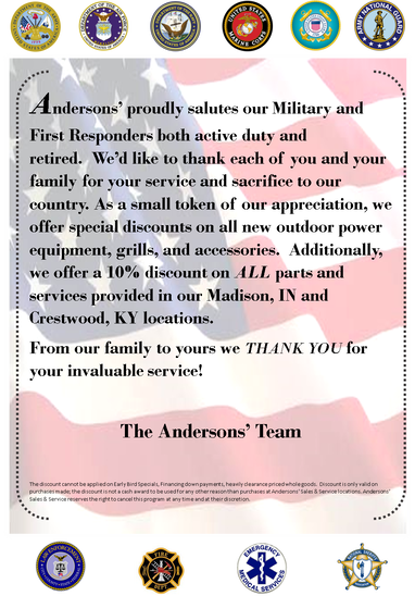 Has been providing outdoor power equipment to Louisville Kentucky and Southern Indiana for over 26 years. Has been providing outdoor power equipment to Louisville and Southern Indiana for over 26 years. - Home Andersons Sales Service Inc.